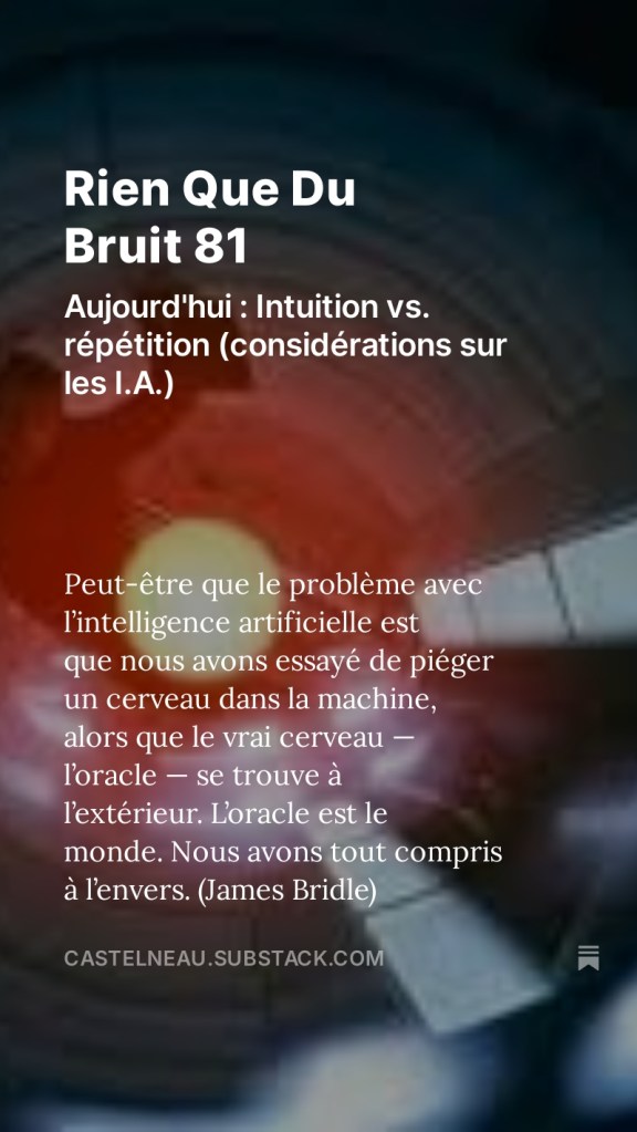 L’infolettre du mois d'octobre est en ligne. Intuition vs. répétition (considérations sur les I.A.). On la retrouve ici 👉 Rien Que Du Bruit# 81
